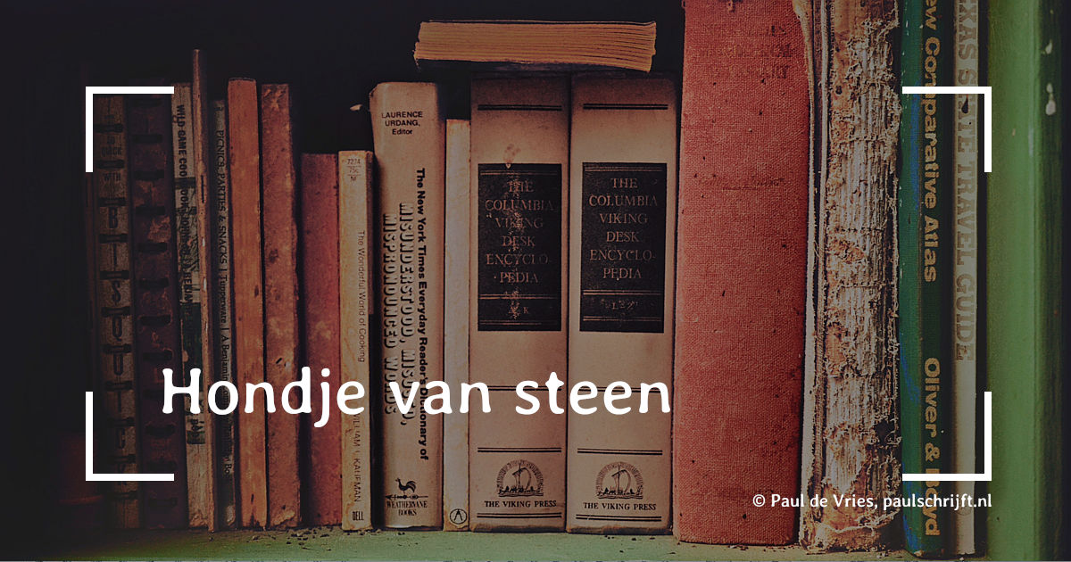Het hondje van steen op de bovenste plank zit stil naar de kaften te kijken.